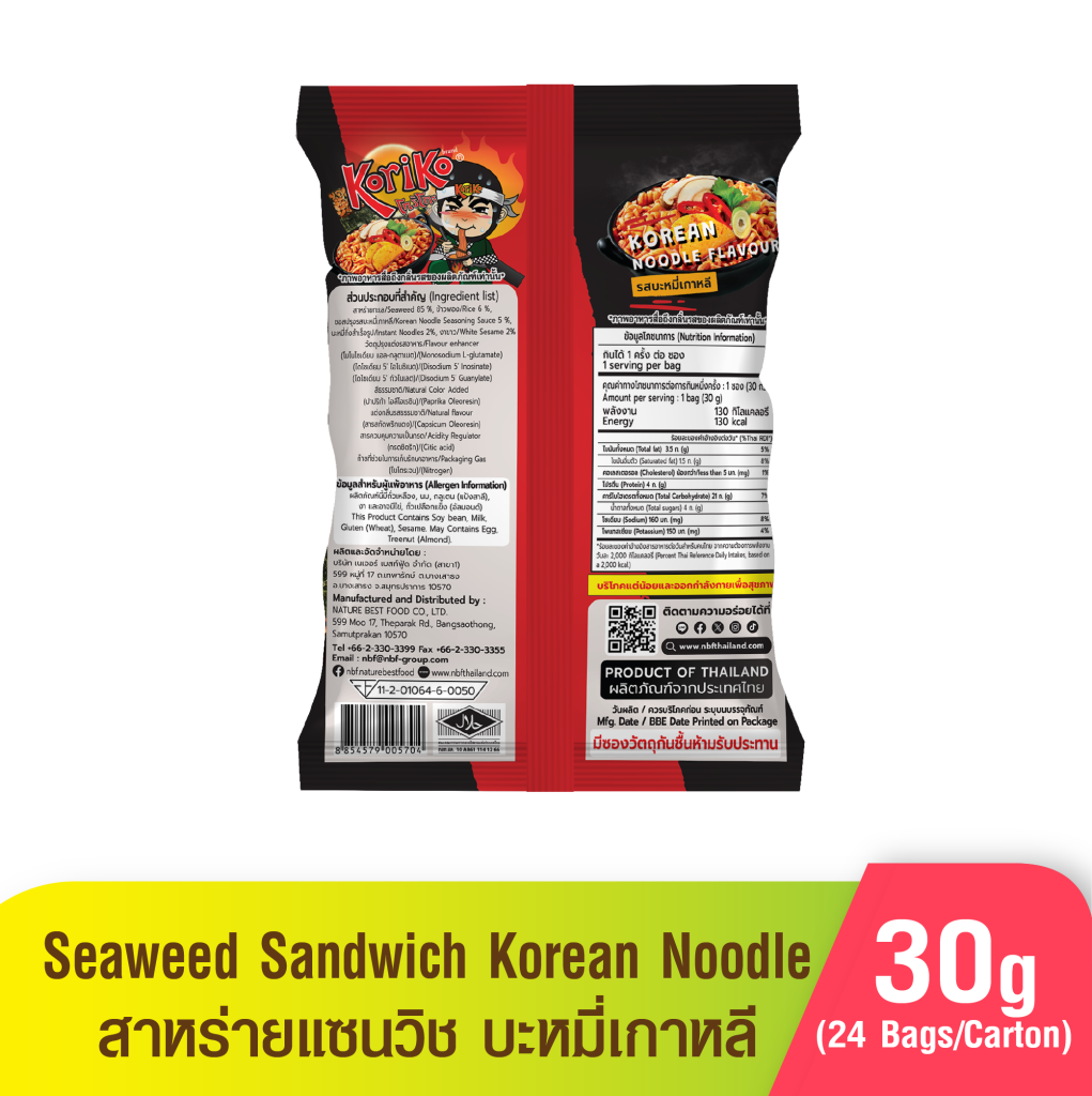 สาหร่ายทะเล/Seaweed 85 %, ข้าวพอง/Rice 6 %, ซอสปรุงรสบะหมี่เกาหลี/Korean Noodle Seasoning Sauce 5 %, บะหมี่กึ่งสำเร็จรูป/Instant Noodles 2%, งาขาว/White Sesame 2%