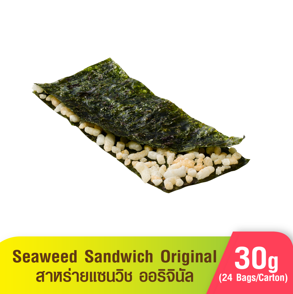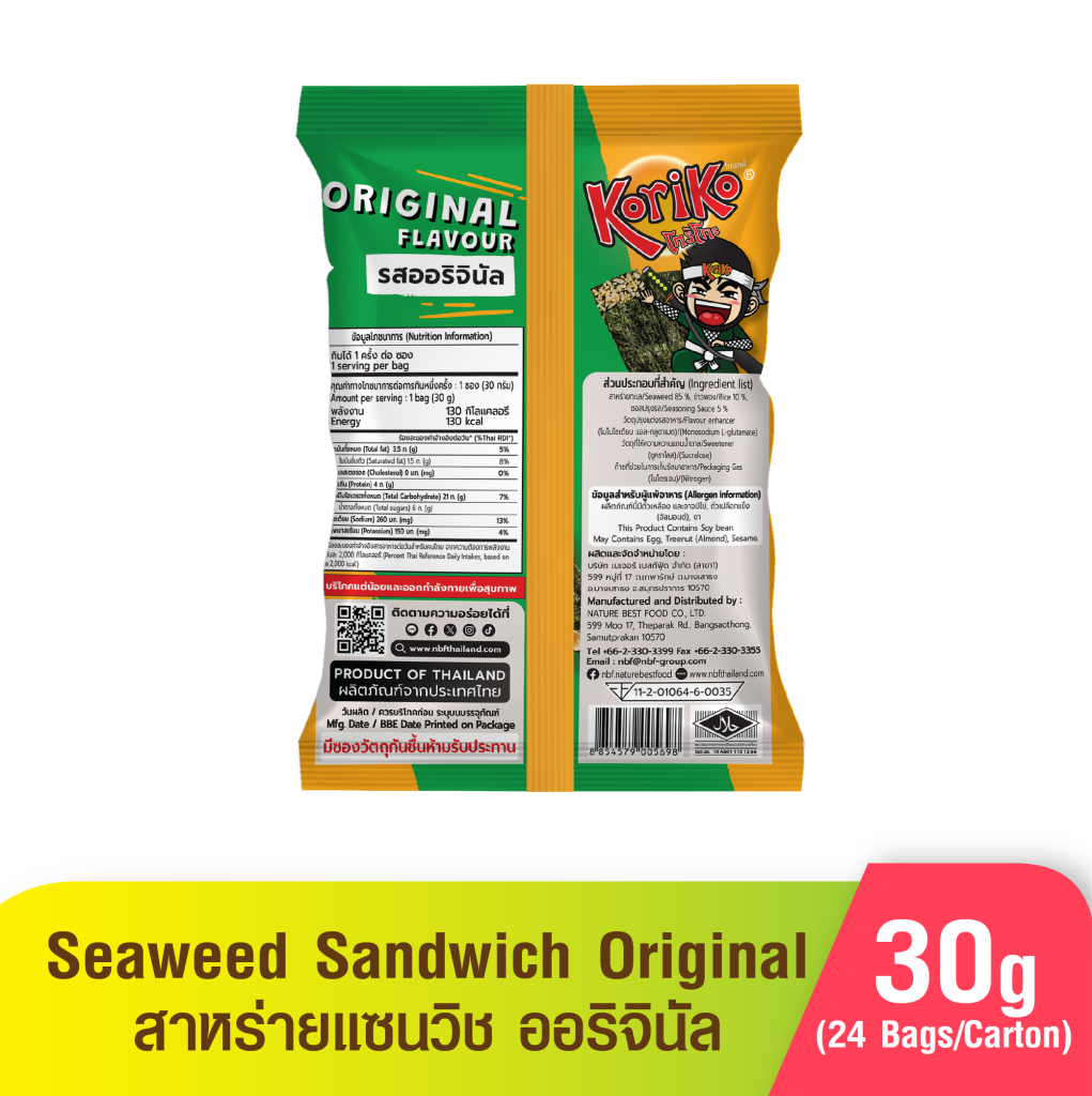 สาหร่ายทะเล/Seaweed 85 %, ข้าวพอง/Rice 10 %, ซอสปรุงรส/Seasoning Sauce 5 %